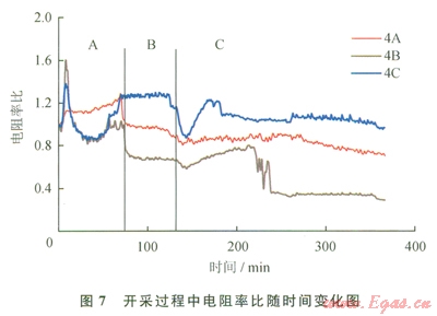 下面研究一下這些開采現(xiàn)象所對應的電阻率變化規(guī)律。仍然以4A、4B和4C測點的電阻率為例,研究開采過程中電阻率的變化。圖7為開采過程中電阻率隨時間變化曲線。如圖7所示,在自由氣釋放階段A中,首先由于自由氣的大量放出,導致中層4B和下層4C電阻率下降較為明顯,而在上層4A測點電阻率反而略有上生,這表明氣體通過上層水平井流出,導致各層電阻率變化,并且在自由氣釋放階段的后期由于產水導致中、下層電阻率的上升;在降壓開采過程中,由于水合物分解導致電阻率緩緩下降,但是不明顯,這主要是由于降壓分解降低水合物飽和度,但是并未降低至上文中提到的可以明顯影響電阻率的水合物飽和度值,所以下降并不明顯;在注熱開采初期,由于大量水合物分解導致氣體和水的流動性較大,所以水合物藏內的電阻率變化具有一定隨機性,不過隨著注熱的進行,水合物逐漸分解完,導致電阻率總體呈下降趨勢。