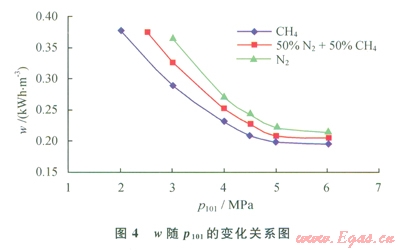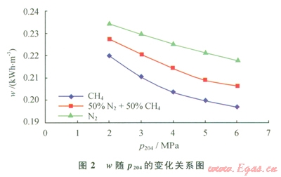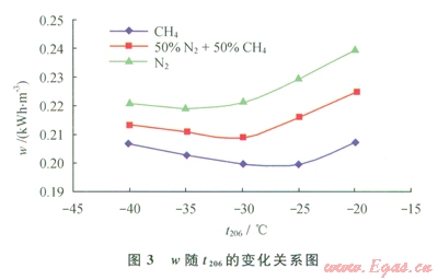 當(dāng)進(jìn)口天然氣壓力(P101)為5MPa、LNG儲(chǔ)存壓力(P104)為2MPa、氣體制冷劑膨脹前壓力(P204)為5MPa時(shí),在一定范圍內(nèi)改變氣體制冷劑膨脹前預(yù)冷溫度(t206),通過(guò)HYSYS軟件模擬計(jì)算可得到產(chǎn)品LNG的單位能耗(w),進(jìn)而得到w隨t206的變化關(guān)系(圖3)。由圖3可知,產(chǎn)品LNG單位能耗先隨制冷劑膨脹前預(yù)冷溫度的增加而降低,后又隨之增加而增加。這是因?yàn)榕蛎浨皽囟容^低時(shí),流程的熱負(fù)荷較大,造成制冷劑流量上升,壓縮機(jī)功耗隨之增加,從而導(dǎo)致產(chǎn)品LNG能耗增加。膨脹前溫度較高時(shí),膨脹后的溫度也較高,引起膨脹后壓力自調(diào)節(jié)降低壓力,壓縮機(jī)功耗隨之增加,從而導(dǎo)致產(chǎn)品LNG能耗增加。故而制冷劑存在一個(gè)最優(yōu)膨脹前壓力,南圖3可知,t206為-25℃、-30℃、-35℃時(shí)分別是CH4、50%N2+50%CH4、N2制冷劑的最優(yōu)膨脹前預(yù)冷溫度。
