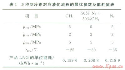通??紤]到安全因素,N2是首選的膨脹制冷劑,為降低能耗,N2-CH4混合物也常被用作制冷劑[7]。通過(guò)上述對(duì)CH4、50%N2+50%CH4和N2這3種制冷劑的研究,可得到3種對(duì)應(yīng)液化流程的最優(yōu)參數(shù)及能耗值(表1)。由表l可知,CH4、50%N2+50%CH4和N2這3種制冷劑膨脹前預(yù)冷溫度的最優(yōu)值依次降低,這是由于N2的液化溫度低于CH4的液化溫度而造成的。由圖5及表l不難發(fā)現(xiàn)這3種制冷劑中N2的能耗最高,CH4的能耗最低,這是因?yàn)檫M(jìn)口天然氣的比熱容隨溫度變化的性質(zhì)與CH4制冷劑的比熱容隨溫度變化的性質(zhì)十分接近[11],使得天然氣與制冷劑換熱時(shí)的平均溫差較小,炯損失較小,能耗也較低。