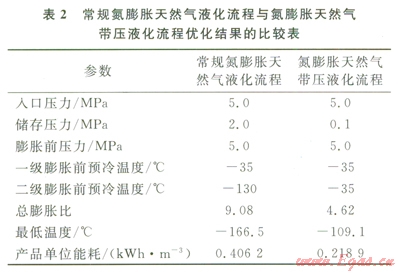經(jīng)過(guò)模擬和優(yōu)化計(jì)算,表2列出了常規(guī)氮膨脹天然氣液化流程和氮膨脹天然氣帶壓液化流程的優(yōu)化結(jié)果。比較可知,二者的最優(yōu)入口壓力、膨脹前壓力和預(yù)冷溫度是相同的。由此可見(jiàn),和常規(guī)氮膨脹流程相比,氮膨脹天然氣帶壓液化流程具有以下優(yōu)點(diǎn):①膨脹比降低,約為前者的一半;②最低溫度為-l66℃,比前者提高了約56℃;③產(chǎn)品LNG單位能耗僅為0.2189kwh/m3,相較前者的0.4062kwh/m3降低了約46%;④此外,膨脹比的降低使其可以省去一個(gè)壓縮膨脹機(jī)組,使流程結(jié)構(gòu)更簡(jiǎn)單,占地面積更小,并且使流程設(shè)備更少,初投資更低。