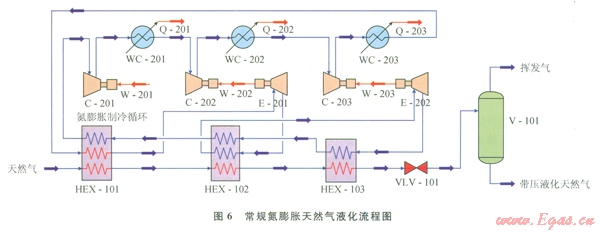 HYSYS模擬的常規(guī)氮膨脹天然氣液化流程如圖6所示[12]。經(jīng)過(guò)預(yù)處理后的進(jìn)口天然氣通過(guò)換熱器HEX-l01和HEX-l02降溫,然后節(jié)流至l01kPa變?yōu)?span lang="EN-US">LNG,送入儲(chǔ)罐V-101。液化流程所需冷量由氮膨脹制冷循環(huán)提供,由于常規(guī)液化流程所需的低溫更低,若采用單級(jí)膨脹會(huì)導(dǎo)致膨脹機(jī)的膨脹比非常大,故而一般采用兩級(jí)膨脹為流程提供冷量和所需的低溫。氮?dú)庵评鋭┦紫冉?jīng)過(guò)三級(jí)壓縮水冷器,再進(jìn)入膨脹機(jī)E-201膨脹降溫,接著進(jìn)入換熱器HEX-102為其提供冷量,然后進(jìn)入膨脹機(jī)E-202繼續(xù)膨脹降溫,接著依次通過(guò)三級(jí)換熱器為其提供冷量,最后復(fù)溫回到壓縮機(jī)。其中膨脹機(jī)E-201和E-202產(chǎn)生的膨脹功分別由壓縮機(jī)C-202和C-203完全回收利用,構(gòu)成兩個(gè)壓縮膨脹機(jī)組。由于常規(guī)天然氣液化流程的進(jìn)口天然氣要經(jīng)過(guò)CO2預(yù)處理,CO2的含量一般不超過(guò)0.01%。因此,這里仍舊取99.99%CH4+0.01%CO2作為進(jìn)口原料氣。