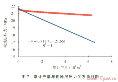 前面4個(gè)測(cè)試點(diǎn)呈現(xiàn)線性關(guān)系,從第5個(gè)測(cè)試點(diǎn)開始明顯偏離直線段,說明有水侵發(fā)生。若采用水驅(qū)氣藏的壓降法計(jì)算動(dòng)態(tài)儲(chǔ)量,則根據(jù)前面4個(gè)數(shù)據(jù)點(diǎn)的線性關(guān)系為y=-0.289x+22.94,外推出動(dòng)態(tài)地質(zhì)儲(chǔ)量為97.4×108m3,這個(gè)值遠(yuǎn)遠(yuǎn)超過該層的地質(zhì)儲(chǔ)量38.58×108m3,說明水侵發(fā)生得更早。