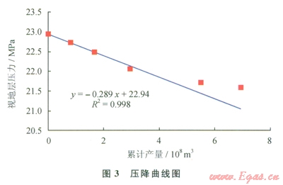 以南海東部PY30-1氣田某氣層為例,該氣藏為邊水氣藏,目前投產(chǎn)了2口井。通過實(shí)測(cè)數(shù)據(jù)點(diǎn)作出該氣藏的壓降曲線如圖3所示。
