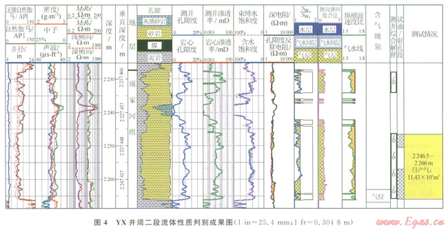 圖4為YX井須二段流體判別成果圖。儲(chǔ)層段2246.5~2266m飽和度比值小于1.3,反映不存在可動(dòng)地層水;孔隙度反算的電阻率低于實(shí)測(cè)電阻率,具有含氣特征;側(cè)向—感應(yīng)比值法判別為氣層,縱橫波速度比小于l.65為氣層。本段錄井顯示為氣侵,測(cè)井綜合解釋為氣層。儲(chǔ)層段2246.5~2266m(射孔段:2246.5~2250.5m、2257~2266m)測(cè)試獲氣ll.43×104m3/d。