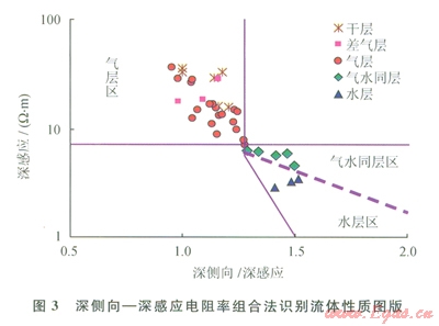 水層則表現(xiàn)為深感應(yīng)電阻率明顯低于深側(cè)向電阻率數(shù)值的特征。其原因是由于淡水鉆井液濾液的侵入導(dǎo)致探測(cè)深度較淺的側(cè)向測(cè)井受高阻沖洗帶的影響更大。而水層由于含高礦化度地層水,其電阻率非常低,深感應(yīng)測(cè)井主要反映原狀地層的低電阻率特征。因此,水層的第二個(gè)特征是深感應(yīng)電阻率比較低,而且儲(chǔ)層的孔隙度愈高、其電阻率數(shù)值愈低。因此在測(cè)井資料質(zhì)量可靠的前提下,根據(jù)試油成果,建立了深側(cè)向與深感應(yīng)電阻率比值法氣水識(shí)別圖版(圖3),氣層深側(cè)向/深感應(yīng)比值介于l~1.3,深感應(yīng)測(cè)量值大于7W·m;水層深側(cè)向/深感應(yīng)比值大于l.3,深感應(yīng)測(cè)量值小于4W·m;其間為氣水同層過(guò)渡區(qū)。