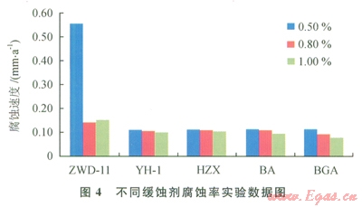 由圖4可以看出,緩蝕劑BGA的緩釋性能最好,加量l.0%時(shí)體系的緩蝕率達(dá)到了99.72%(15%鹽酸為基液的空白實(shí)驗(yàn)對(duì)金屬的腐蝕速率為27.9276mm/a)。結(jié)合元壩地層的溫度情況,選取BGA為酸化解卡液的緩蝕劑。