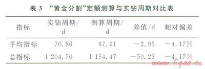 塔里木油田輪南區(qū)塊近4年共完鉆井18口,按照鉆井定額編制原則,選出17口與標(biāo)準(zhǔn)井井型類似的基礎(chǔ)井,編制該區(qū)塊鉆井周期定額。定額測(cè)算周期與實(shí)際鉆井周期對(duì)比結(jié)果見表3??梢钥闯?,采用“黃金分割”測(cè)算出的平均單井鉆井周期比實(shí)際統(tǒng)計(jì)周期縮短2.95d,定額相對(duì)偏差為4.17%,滿足工程實(shí)踐需要。