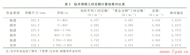 根據(jù)塔里木油田輪南區(qū)塊已鉆井不同井段的樣本數(shù)量,分別采用“3、5、2”分段加權(quán)平均法和“黃金分割”法,編制出該區(qū)塊鉆井周期工時(shí)定額,并對(duì)比分析兩種方法的先進(jìn)程度(表2)。從計(jì)算結(jié)果可以看出,采用“黃金分割”測(cè)算的鉆井周期工時(shí)定額值比“3、5、2”分段加權(quán)平均法測(cè)算值要先進(jìn)l.23%~678%。顯然,采用“黃金分割”法測(cè)算的鉆井周期工時(shí)定額精度要優(yōu)于“3、5、2”分段加權(quán)平均法。