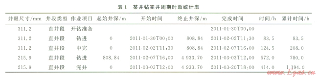 按石油鉆井技術(shù)經(jīng)濟(jì)指標(biāo)分類,將一口井鉆井用井眼尺寸劃分出不同井段(直井段、定向段和水平段),然后將鉆井過程分為開鉆準(zhǔn)備、鉆進(jìn)、完井作業(yè)3個(gè)項(xiàng)目,其中鉆進(jìn)周期為該井眼尺寸自開始鉆進(jìn)至鉆達(dá)設(shè)計(jì)固井深度或固井層位耗費(fèi)的時(shí)間,不包括堵漏、中途測(cè)試及取心等時(shí)間;完井周期為鉆達(dá)固井深度后進(jìn)行測(cè)井、下套管、注水泥及候凝等至下一次開鉆前耗費(fèi)的時(shí)間,如果是鉆達(dá)設(shè)計(jì)地質(zhì)目的層,進(jìn)行完井作業(yè)就是完井時(shí)間。我們采用時(shí)間點(diǎn)原則分別對(duì)不同井眼尺寸的作業(yè)時(shí)間進(jìn)行統(tǒng)計(jì)(表1)。