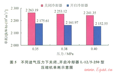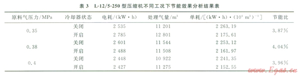 2)結(jié)合現(xiàn)場條件,對L-12/5-250型壓縮機(jī)第二、四級級間回氣管上加裝冷卻器后,在0.35、0.38、0.40Mpa,3種進(jìn)氣壓力下取得的對應(yīng)節(jié)能比分別為3.87%、4.04%、3.96%,驗(yàn)證了該節(jié)能技術(shù)的可行性。