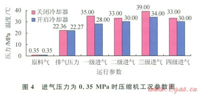 從表2的數(shù)據(jù)可看出,當(dāng)進(jìn)氣壓力為0.35 MPa時(shí)開啟冷卻器后壓縮機(jī)一級進(jìn)氣溫度由35℃降低到28℃,溫度下降了7℃,其他參數(shù)對比分析如圖4所示??傊?,在不同進(jìn)氣壓力下,開啟冷卻器后壓縮機(jī)各級進(jìn)氣溫度都有所下降,對第二、四級級間回氣的冷卻取得了降低壓縮機(jī)進(jìn)氣溫度的效果。