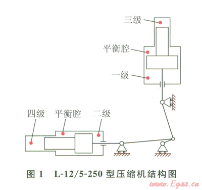 CNG加氣站一般由天然氣預(yù)處理、壓縮、儲(chǔ)存、控制以及CNG售氣等5個(gè)系統(tǒng)組成[3]。CNG壓縮機(jī)是壓縮系統(tǒng)的核心部分,一般為多級壓縮,采用中間冷卻與分離方式降溫、脫液[4]。某加氣站采用2臺L-1e/5—250型壓縮機(jī),為2列四級壓縮(一、三級在豎直列,二、四級在水平列),中間冷卻,有油潤滑,氣缸和中間冷卻器為水冷結(jié)構(gòu),具有運(yùn)轉(zhuǎn)平穩(wěn)、排氣量大、適用范圍廣、維護(hù)費(fèi)用低等優(yōu)勢[5-6]。由于采用了級差式壓縮缸結(jié)構(gòu),同列壓縮缸壓力差別較大,氣體作用力差別較大,為了改善活塞桿的受力狀態(tài)和減小電機(jī)的負(fù)荷,在同列壓縮缸中間設(shè)有平衡腔來平衡活塞力[7]。L-12/5-250型壓縮機(jī)結(jié)構(gòu)如圖l所示,其額定功率為126kw,排氣量為12m3/min,進(jìn)氣壓力為0.5MPa,排氣壓力為25Mpa[8]。