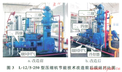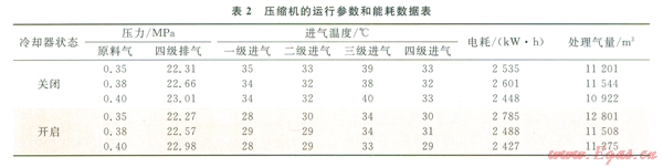 基于上述的節(jié)能技術(shù)原理,由于現(xiàn)場條件的限制,本次改造僅僅在L-12/5-250型壓縮機(jī)第二、四級級間回氣管線上加裝了一套冷卻器,冷卻器換熱面積為1.5,改造前后現(xiàn)場如圖3所示。為了系統(tǒng)分析節(jié)能改造的節(jié)能效果,在不改變冷卻系統(tǒng)和壓縮機(jī)系統(tǒng)其他設(shè)備參數(shù)的條件下,通過系統(tǒng)原有壓力、溫度、氣量、電耗等記錄儀表,分別測試了原料氣進(jìn)氣壓力為0.35、0.38、0.40MPa下關(guān)閉和開啟冷卻器時(shí)壓縮機(jī)的運(yùn)行參數(shù)和能耗,相關(guān)數(shù)據(jù)見表1、2。
