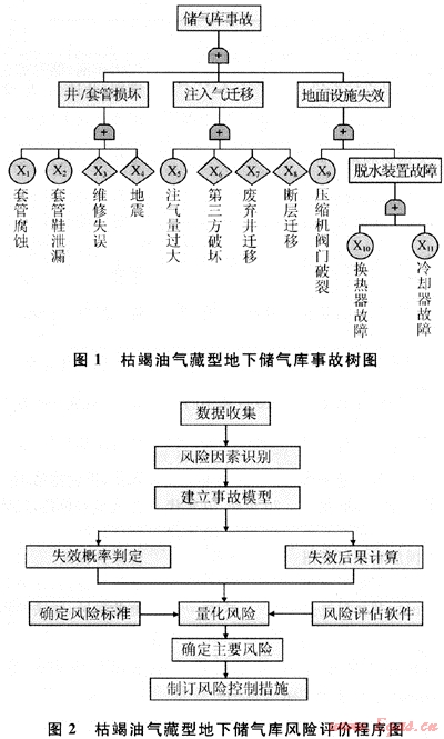 枯竭油氣藏型地下儲氣庫的安全問題至關重要,其風險是多方面的,與儲氣庫的規(guī)劃、設計、施工、運營、維護以及檢修的各過程密切相關。因此必須從系統(tǒng)安全的角度出發(fā),在儲氣庫事故資料統(tǒng)計分析的基礎上,借鑒輸氣管道風險評價方法,結合儲氣庫特點對系統(tǒng)中潛在風險因素進行初步分類,將其劃分為12大類、33小類,并建立事故樹進行主要風險因素識別,進一步利用事故模型判斷系統(tǒng)發(fā)生事故的可能性及其危害程度,確定其風險大小,建立相應的風險評價程序,為制訂風險防范措施和安全管理決策提供科學依據。