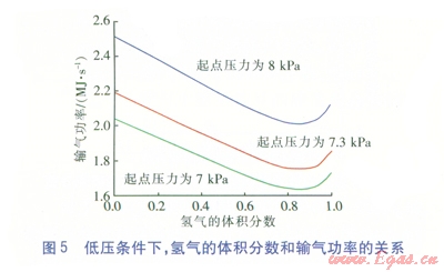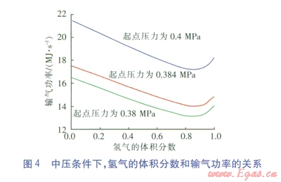由圖4、5可知,增大管道的壓力降后,無論中壓還是低壓條件,管道的輸氣功率均有顯著提升。在中壓條件下,混合氣體中氫氣的體積分?jǐn)?shù)為0.23時,為保證輸氣功率不變,則起點(diǎn)壓力需從0.38MPa增大到0.384MPa。在低壓條件下,混合氣體中氫氣的體積分?jǐn)?shù)為0.23時,為保證輸氣功率不變,則起點(diǎn)壓力需從7kPa增大到7.3kPa。這說明微小提升壓力降,就能保證管道的輸氣能力不變。