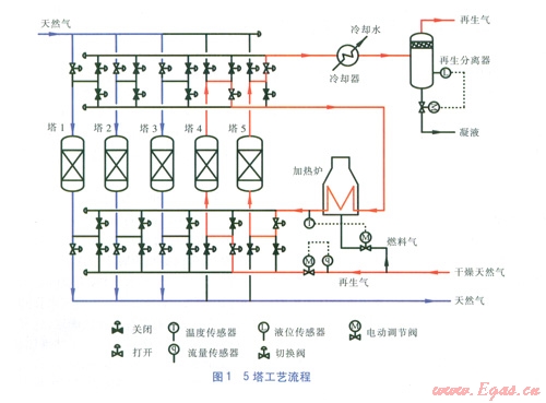 醇。塔5出口再生氣經(jīng)冷卻器冷卻至40℃左右后,進入再生分離器分離出游離水和硫醇,最后進入尾氣處理單元。下一切換周期為塔2、3、4吸附,塔5進行冷卻,塔l進行加熱再生,這樣依次進行。