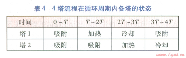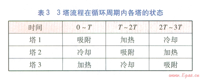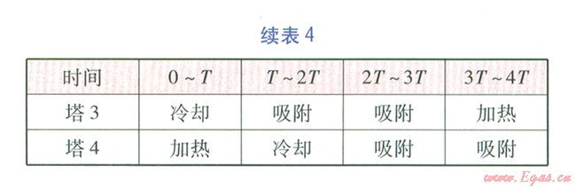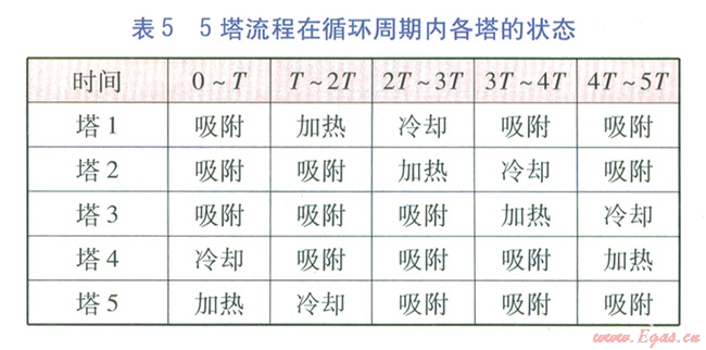 由5塔流程可知,再生氣先對已加熱再生分子篩塔進行冷卻,然后經(jīng)加熱爐升溫后對已完成吸附的分子篩塔進行加熱再生,這個過程是同時和連續(xù)的。當對已加熱再生分子篩塔的冷卻完成后,才能進行分子篩塔的切換,我們將分子篩塔的冷卻或加熱再牛時間稱為切換周期r。將每座塔均被加熱再生、冷卻一次的時間稱為循環(huán)周期,例如對于3塔、4塔、5塔流程,循環(huán)周期分別為3T、4T、5 T。3塔、4塔、5塔流程在循環(huán)周期內(nèi)各塔的狀態(tài)分別見表3~5。
