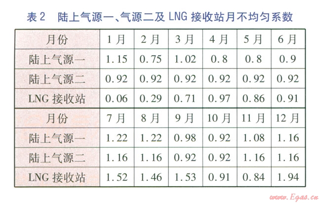 該地區(qū)共存在4種氣源供氣,其中陸上氣源一供氣量為30×108m3/a,陸上氣源二供氣量為18×108m3/a,陸上氣源三供氣量為36×108m3/a,LNG氣源供氣量為30×108m3/a。陸上氣源一和氣源二月供氣特性見表2;陸上氣源三為均勻供氣。LNG接收站用于承擔(dān)該地區(qū)除陸上氣源調(diào)峰外的所有季節(jié)調(diào)峰,可通過(guò)供需平衡和各氣源供氣特性計(jì)算出每月LNG接收站外輸量,得出LNG接收站供氣的月不均勻系數(shù)(見表2)。