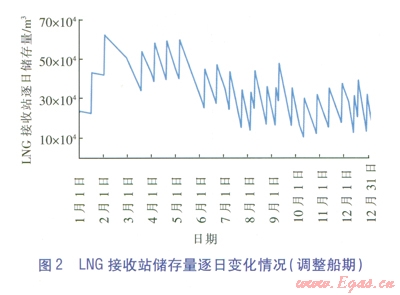 假設(shè)該LNG接收站LNG設(shè)計(jì)儲(chǔ)存規(guī)模為64×104m3 (4座16×104m3LNG儲(chǔ)罐),通過(guò)動(dòng)態(tài)分析方法計(jì)算結(jié)果可知,每年需調(diào)整LNG船的船期,其中:2、3、5月份需各減少接收l船LNG;8、9、12月份需各增加接收l船LNG;其余月份仍保持每月接收2船LNG不變。通過(guò)調(diào)整船期方法得到的LNG接收站儲(chǔ)存量逐日變化情況見圖2.