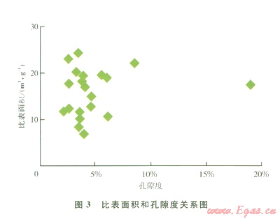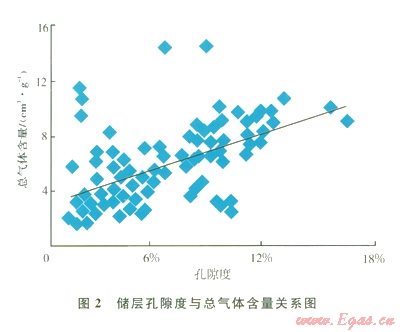 頁巖儲層為裂縫-孔隙結(jié)構(gòu),成巖作用過程中形成的裂縫和微孔是頁巖氣儲集空間和滲流通道。微孔對頁巖氣的儲存具有重要意義,一般而言,微孔體積越大,比表面積越大,對氣體吸附能力也就越強。國外測定的含氣頁巖巖心數(shù)據(jù)㈠表明,孔隙度與總氣體含量正相關(guān),受孔徑分布影響。圖2為國外實驗室測定的頁巖孔隙度與含氣量關(guān)系。