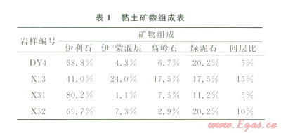 表1為頁巖樣品黏土礦物相對含量分析結(jié)果。從分析結(jié)果可以看出,儲層黏土礦物類型和含量相差較大,主要以伊利石為主。頁巖礦物的相對含量和儲層膠結(jié)物含量變化將會影響頁巖的巖石力學(xué)性質(zhì)、孔隙結(jié)構(gòu)、氣體吸附能力等。石英含量影響頁巖的脆性,石英和碳酸鹽礦物含量越多,頁巖脆性越高,頁巖的孔隙越少,游離頁巖氣的儲集空間越少;方解石的膠結(jié)作用會導(dǎo)致儲層孔隙減少。黏土礦物表面積較大,微孔隙較多,當水未飽和時對頁巖氣有較強的吸附能力。