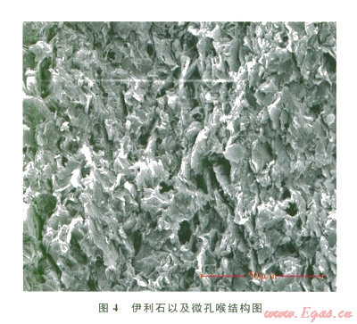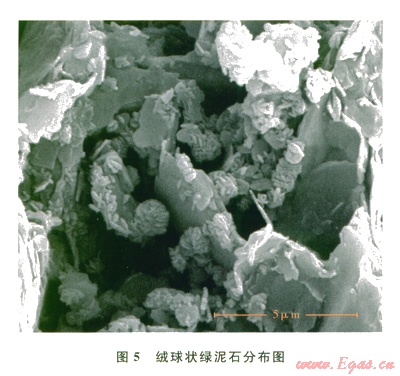 圖4、5是掃描電鏡觀測到的伊利石和綠泥石分布狀態(tài)。伊利石的吸附流體作用在TOC較低的頁巖中有很重要的影響。絨球狀綠泥石一般不具有膨脹性,只有在水鎂石八面體晶片酸蝕失玄了Mg2+、Fe3+的條件下才會導(dǎo)致水鎂石解體出現(xiàn)晶間膨脹。
