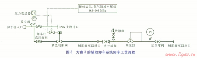 ②從安全角度對3種輔助卸車方案進行比較,認為第2種方案更具優(yōu)勢。在不影響供氣量的前提下,不僅使CNG氣瓶車的余氣量更少,還大大縮短了卸車時間,提高了CNG氣瓶車的運輸能力,大大降低了綜合運營成本。
