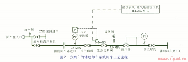 輔助卸車系統(tǒng)是在CNG減壓橇中單獨設(shè)置一路卸車調(diào)壓系統(tǒng),當CNG氣瓶車內(nèi)壓力低(一般小卸車柱入口于4.0 MPa)時,通過高壓閥組切換到輔助卸車路,后一輛CNG氣瓶車連接到主路。前一輛CNG氣瓶車中的低壓CNG通過輔助卸車路,先進入輔助卸車路中的調(diào)壓器,經(jīng)調(diào)壓后進入CNG主路二級調(diào)壓后的管道中。