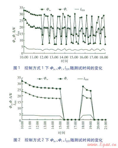 采用控制方式l時(shí),隨著單臺、兩臺壓縮機(jī)切換,Фex、Фr、IEER出現(xiàn)波動。當(dāng)兩臺壓縮機(jī)運(yùn)行時(shí),Фex的平均值為20 kW,Фr的平均值為29 kW,IEER的平均值為3.1。單臺壓縮機(jī)運(yùn)行時(shí),Фex的平均值為8 kW,Фr的平均值為l3 kW,IEER的平均值為2.1。經(jīng)計(jì)算可得,控制方式l下,聯(lián)合供暖系統(tǒng)的平均能效比為2.6。