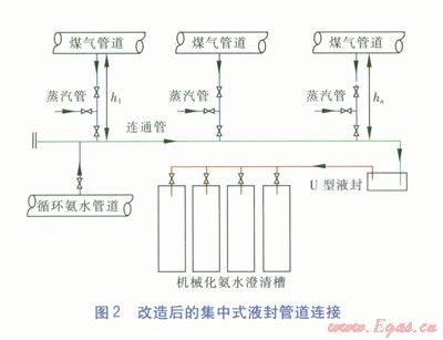 層為焦油,下層為焦油渣,沉淀在槽底的焦油渣由刮板輸送機排出槽外,焦油則通過液面調(diào)節(jié)器流至焦油槽,澄清后的氨水經(jīng)上部溢流至循環(huán)氨水槽,送往后續(xù)工段使用。改造后的集中式液封管道連接見圖2。