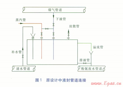 按原設(shè)計,煤氣輸送主管道上的附屬液封一期有6個(其余液封為設(shè)備專用液封)、二期有8個(其余液封為設(shè)備專用液封);每個液封都設(shè)有放散管、下液管、溢流管、排液管及蒸汽管等附屬管道,所有下液最后經(jīng)溢流管流至酚氰廢水管道匯合至污水處理站。原設(shè)計中液封管道連接見圖l。