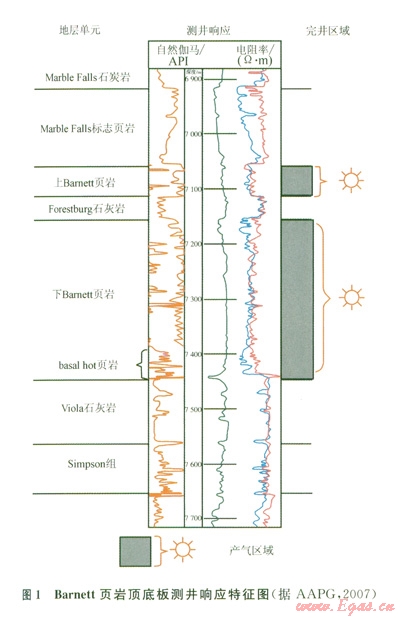 基于技術(shù)和成本方面的考慮,國(guó)外對(duì)頂、底板的研究歷來(lái)比較重視[4-5]。北美一些主要的頁(yè)巖氣盆地大都具有“三明治”式的展布特征。以美國(guó)福特沃斯盆地著名的Barnett頁(yè)巖為例,上Barnett頁(yè)巖以Marble Falls石灰?guī)r為頂板,Forestburg石灰?guī)r作為底板,圖1顯示,頂?shù)装逄帨y(cè)井響應(yīng)特征為低自然伽馬值、高電阻率;而上Barnett頁(yè)巖段則顯示為高伽馬值、低電阻率的特征,可以明顯區(qū)分。下Barnett頁(yè)巖則是以Forestburg石灰?guī)r和Viola石灰?guī)r分別作為頂、底板,相應(yīng)的頁(yè)巖氣藏也位于頂、底板之間的含氣泥頁(yè)巖層段內(nèi),封閉性較好。頂、底板封閉的含氣泥頁(yè)巖段為主力產(chǎn)氣層[6]。
