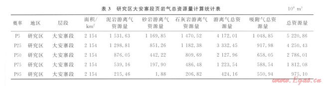 通過(guò)統(tǒng)計(jì)出的每口井含氣頁(yè)巖層段的厚度,可以繪制出含氣頁(yè)巖層段厚度等值線圖,同時(shí)結(jié)合地震資料追蹤有效層段,控制平面上等值線的走勢(shì)。根據(jù)研究區(qū)塊大安寨段巖石物性分析測(cè)試數(shù)據(jù),大安寨段頁(yè)巖密度平均為2.61 g/cm3。根據(jù)實(shí)例井大安寨段實(shí)測(cè)TOC資料及現(xiàn)有的測(cè)井資料進(jìn)行了多元統(tǒng)計(jì)分析擬合,計(jì)算出吸附氣量,繪制TOC等值線圖及吸附氣量等值線圖,計(jì)算出吸附氣資源量;根據(jù)實(shí)測(cè)孔隙度資料、現(xiàn)有的測(cè)井?dāng)?shù)據(jù)分別分析擬合、計(jì)算孔隙度,進(jìn)而計(jì)算含水(氣)飽和度和游離氣百分含量,最終得到游離氣資源量;最后計(jì)算m該研究區(qū)不同概率的總資源量(表3)。