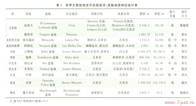筆者通過(guò)文獻(xiàn)調(diào)研[5],對(duì)全球主要盆地含氣泥頁(yè)巖層段(系統(tǒng))頂、底板的地質(zhì)特征進(jìn)行了統(tǒng)計(jì)。結(jié)果顯示(表1),世界范圍內(nèi)主要盆地頁(yè)巖地層頂、底板巖性以致密的泥頁(yè)巖、膏泥巖、膏鹽層、石灰?guī)r、白云巖、火山巖、煤層等為主,屬于非滲透或低滲透巖層。其埋深范圍從l