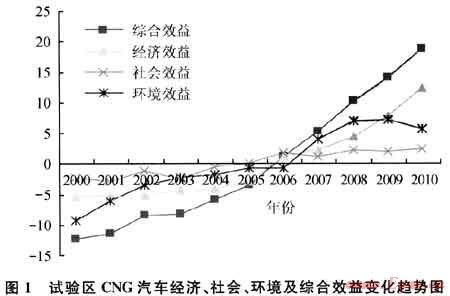 通過構建社會、經(jīng)濟和環(huán)境效益的評價指標和指標體系,采用主成分分析法對試驗區(qū)CMG汽車城際化運行進行經(jīng)濟、社會、環(huán)境及綜合效益評價。主成分分析法是把原來多個變量轉化為少數(shù)幾個綜合指標的一種統(tǒng)計分析方法,即用較少的幾個綜合指標來代替原來較多的變量指標,而且使這些較少的綜合指標既能盡量多地反映原來較多指標所反映的信息,同時它們之間又彼此獨立[2]。通過收集歷年CNG汽車產(chǎn)業(yè)統(tǒng)計資料數(shù)據(jù),建立了以CNG汽車產(chǎn)業(yè)總產(chǎn)值、利稅總額等10個經(jīng)濟效益評價指標,CNG產(chǎn)業(yè)燃油替代量、新增就業(yè)人數(shù)等5個社會效益評價指標,CNG汽車C0、CO2減排量等7個環(huán)境效益指標,用分車型各個排放因子的檢測數(shù)據(jù)統(tǒng)計平均值,對汽車尾氣各因子的排放量和減排量的測算分析,試驗區(qū)經(jīng)濟效益、社會效益、環(huán)境效益和綜合效益評價結果見圖1。結果表明,在2000—2010年間,試驗區(qū)CNG汽車產(chǎn)業(yè)發(fā)展的綜合效益一直呈現(xiàn)增長趨勢,由-12.4302增長到18.81287;經(jīng)濟效益由-5.51459增長到12.41559;社會效益的變化則比較平緩,由-2.32735增長到2.356 903;環(huán)境效益由-9.3076增加到5.57548。