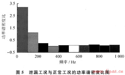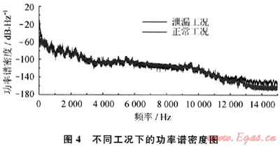 從圖4可以看出,泄漏工況的功率譜和正常工況的功率譜在很長(zhǎng)的頻率段上是基本重合的,只是在起點(diǎn)附近兩者有所不同。隨著頻率的增大,不論是泄漏工況還是正常工況,其功率譜密度都逐漸減小,最終逐漸趨于穩(wěn)定,即高頻部分基本為白噪聲部分。