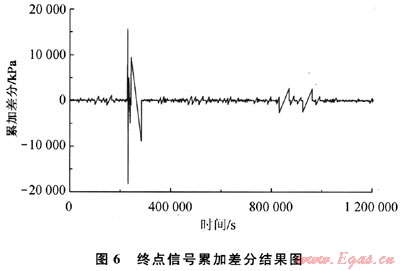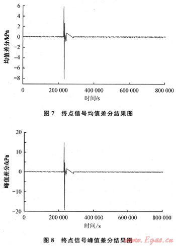 從上面對(duì)音波信號(hào)的時(shí)域和頻域分析中可以看出,信號(hào)的幅值和功率譜密度是可以作為泄漏判斷的特征量的,這驗(yàn)證了1.1節(jié)的分析結(jié)果。除此之外,1.1節(jié)提出的相鄰區(qū)間信號(hào)累加差分、均值差分、峰值差分的特征識(shí)別方法,也可以作為泄漏檢測(cè)的判斷依據(jù)。當(dāng)管道起點(diǎn)壓力為4.6MPa左右,泄漏孔徑為0.45mm時(shí),將泄漏點(diǎn)1發(fā)生泄漏時(shí)采集到的測(cè)試管段終點(diǎn)的聲壓進(jìn)行去噪,根據(jù)提出的相鄰區(qū)間信號(hào)累加差分、均值差分、峰值差分的算法,可分別得到終點(diǎn)信號(hào)累加差分結(jié)果如圖6所示,終點(diǎn)信號(hào)均值差分結(jié)果如圖7所示,終點(diǎn)信號(hào)峰值差分結(jié)果如圖8所示。