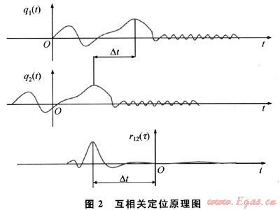 通過(guò)求相關(guān)函數(shù)r12(r)的極大值和極大值對(duì)應(yīng)的τ0,即可進(jìn)行泄漏檢測(cè)和定位。互相關(guān)定位原理圖如圖2所示。