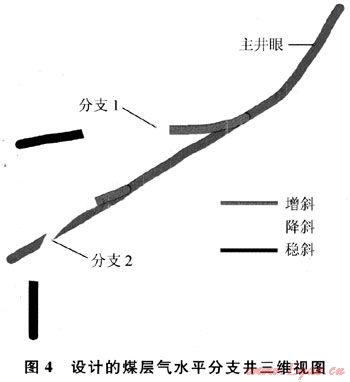 3) 分支類(lèi)型3:增斜+穩(wěn)斜。軌跡設(shè)計(jì)和控制最簡(jiǎn)單,一般在煤層中的延伸距離最短。