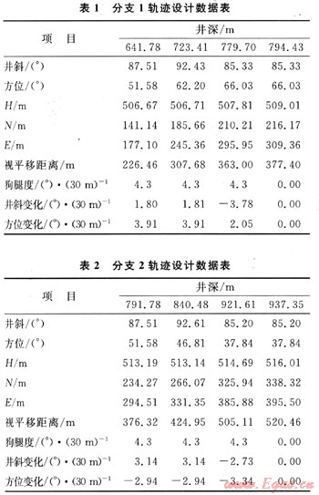 本文參考文獻(xiàn)[1]給出了Ai、Bi、Ci的計(jì)算方法,由式(7)、(8)求得煤層氣水平分支井三維軌跡設(shè)計(jì)的約束方程為:Lm1=Lm2,其有解的判別式為△=Bi2-4AiCi≥0(i=1,2)。因此,可精確求出造斜率K0,通過(guò)改變L1和L2可使K0逼近于工具造斜率K,從而設(shè)計(jì)出滿(mǎn)足約束條件的三維設(shè)計(jì)軌跡。