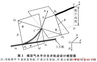 煤層氣水平分支井技術(shù)通過(guò)將主井眼和分支井眼部署在同一產(chǎn)層,在水平段主體井眼兩側(cè)側(cè)鉆分支來(lái)增加煤層的橫向動(dòng)用程度,以此提高煤層氣井的開(kāi)發(fā)效率。在國(guó)外,已開(kāi)發(fā)出專(zhuān)門(mén)用于煤層氣水平分支井的軌跡設(shè)計(jì)軟件,并取得了很好的應(yīng)用效果;而國(guó)內(nèi)對(duì)煤層氣水平分支井的研究雖已取得了一定進(jìn)展,但仍有待于發(fā)展和完善。截至目前,國(guó)內(nèi)有關(guān)分支爬高高度和工具造斜率約束下煤層氣水平分支井軌跡設(shè)計(jì)的文獻(xiàn)尚未見(jiàn)報(bào)道,加之國(guó)外對(duì)其設(shè)計(jì)方法和模型算法尚未公開(kāi),限制了煤層氣水平分支井技術(shù)在我國(guó)的進(jìn)一步推廣和應(yīng)用。