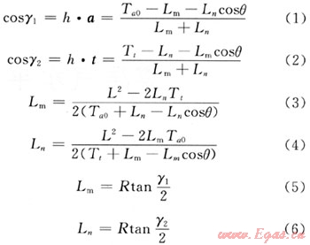 式中L為A1、B1兩點(diǎn)之距,Ta0和Tt分別為A1B1矢量a、t上的投影長(zhǎng)度,θ為a、t之間的夾角。由式(1)~(6)求得: