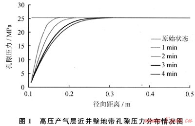 從圖1可以看出,高壓氣層一旦被氣體鉆井揭開后,近井壁地帶孔隙壓力分布發(fā)生明顯變化。井壁表面巖石孔隙壓力與井筒內(nèi)壓力相等,隨著距井壁表面距離的增加,孔隙壓力逐漸增加,直至恢復(fù)原始地層孔隙壓力。