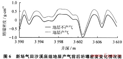 川西地區(qū)新場氣田利用空氣鉆井技術(shù)鉆探沙溪廟組地層時(shí),鉆遇產(chǎn)氣層段,產(chǎn)氣層短時(shí)間產(chǎn)氣后引起井下遇阻卡鉆事故,隨后被迫轉(zhuǎn)換為常規(guī)鉆井。利用前面建立的高壓產(chǎn)氣層氣體鉆井井壁穩(wěn)定性評價(jià)方法分析了新場氣體沙溪廟組產(chǎn)氣層段不產(chǎn)氣和產(chǎn)氣瞬間兩種情況下的坍塌密度變化情況,如圖6所示。