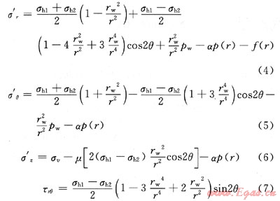 式中σ′r、σ′θ、σ′z和τrθ分別表示徑向、周向、垂向的有效應(yīng)力和剪切力,MPa;σw表示上覆地層壓力,MPa;σh1、σh2分別表示兩個(gè)水平方向主地應(yīng)力,MPa;α表示有效應(yīng)力系數(shù),無量綱;μ表示巖右靜態(tài)泊松比;θ表示圓周角,(°);p(r)表示距井壁表面處孔隙壓力,MPa;f(r)表示距井壁表面處拖曳力,MPa。