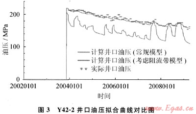 歷史擬合是對地質(zhì)模型參數(shù)場的修正,也是對地質(zhì)再認識的過程。常規(guī)模型歷史擬合調(diào)參前井口油壓擬合較好的井有24口,占所有氣井的比例為18.2%,且多數(shù)井模型計算壓力較實際壓力偏高;考慮阻流帶的模型壓力擬合較好的井約有72口,所占比例達到54.5%,多數(shù)井計算壓力與實際壓力更加接近,空間擬合誤差對比圖見圖1、2。此外,阻流帶的引入還克服了歷史擬合參數(shù)調(diào)整有時范圍較大、不合理的弊端。Y42-2井試井解釋滲透率為0.4mD,表皮系數(shù)為-5.8,邊界面積1.71km2。常規(guī)模型需要將滲透率減小,油壓才能基本擬合上,且曲線變化趨勢仍然與實際存在較大偏差,顯然這種修改是不符合實際的。引入阻流帶以后,將滲透率減小為原來的50%,油壓迅速擬合到實際水平,壓力變化趨勢與實際相符(圖3),這也從另一方面證實了阻流帶的存在。由此可見,考慮阻流帶之后歷史擬合工作變得更加容易,部分井甚至不需要調(diào)參即可完成擬合,進一步證實了阻流帶模型的可靠性。值得注意的是:并不是所以井之間都存在阻流帶,還應結(jié)合井間干擾分析成果,對部分井間連通區(qū)域進行修改。通過反復修改參數(shù)場,對每口井進行了壓力和產(chǎn)水的擬合,得到模型最終計算儲量710.9×108m3,與地質(zhì)儲量719.21×108m3相差不大,誤差在5%以內(nèi),認為修正后的模型能夠基本代表氣藏實際[8]。