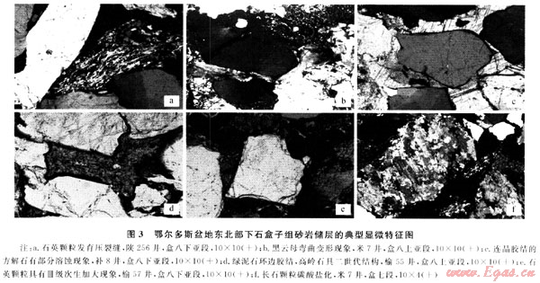 指松散沉積物在上覆水體和沉積物負荷壓力作用下發(fā)生總體積縮小和孔隙度降低的一種成巖作用方式,是儲層形成過程中一種主要的破壞性成巖作用。鄂爾多斯盆地東北部下石盒子組砂巖儲層的埋藏深度大,機械壓實作用強,埋藏史模擬得出的最大古埋深介于3000~4100m之間(早白堊世末)[7],當前埋藏深度介于2000~3300m之間。顯微鏡下砂巖呈顆粒支撐,顆粒間以線接觸為主,部分呈點-線接觸或凹凸狀接觸;石英或巖屑等剛性碎屑發(fā)育壓實作用形成的脆性微裂紋和壓溶現(xiàn)象(圖3-a);云母碎屑、千枚巖、泥巖巖屑等塑性顆粒被壓實變形(圖3-b),甚至呈假雜基充填顆粒間。這些現(xiàn)象表明砂巖儲層經(jīng)歷了較強的壓實作用。強烈的壓實作用不但喪失了大部分的原生孔隙,也不利于次生孔隙孔隙的保存,是研究區(qū)砂巖儲層致密化的一個重要因素。