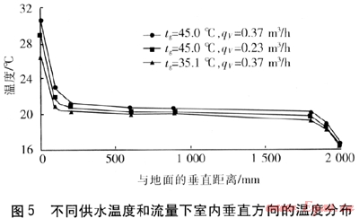 在不同供水溫度和流量下,室內(nèi)垂直方向溫度分布見(jiàn)圖5。由圖5可知:①隨著高度的增加,空氣溫度迅速降低,在距地面200mm處溫度基本達(dá)到穩(wěn)定,而在距地面1800mm以上溫度迅速降低。②隨著供水流量的增大與供水溫度的升高,各測(cè)點(diǎn)溫度也相應(yīng)升高,且在地面附近溫度差異明顯,在頂棚附近溫度沒(méi)有明顯變化。這種現(xiàn)象反映r熱管地板輻射采暖與普通地板輻射采暖的特點(diǎn)一致,即室內(nèi)空氣垂直方向溫度梯度小。