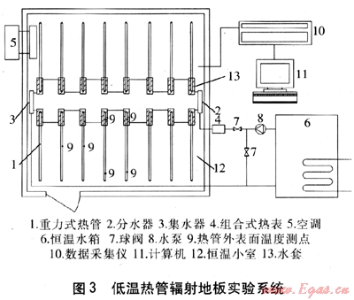 碳鋼/水重力式熱管(又稱碳鋼/水兩相閉式熱虹吸管)具有結(jié)構(gòu)簡(jiǎn)單、成本低廉、傳熱性能優(yōu)良、工作可靠等特點(diǎn),在冶金、化工、建材、動(dòng)力等行業(yè)有很多成功的應(yīng)用實(shí)例[1]。隨著熱管技術(shù)的不斷成熟,其在建筑行業(yè)的應(yīng)用引起了學(xué)者們的關(guān)注。JEBRAIL等制作了熱管散熱器并測(cè)試了其熱工性能[2],國(guó)內(nèi)學(xué)者蔣愛(ài)華等對(duì)熱管輻射墻壁進(jìn)行了探討[3],羅清海等分析了不同工質(zhì)熱管散熱器的熱工性能[4]。本文擬將碳鋼/水重力式熱管與地板輻射采暖系統(tǒng)結(jié)合起來(lái),以期利用其優(yōu)良的傳熱性能,在提供舒適熱環(huán)境的同時(shí),達(dá)到降低供水溫度、減小熱水循環(huán)流量、提高系統(tǒng)整體運(yùn)行效率和經(jīng)濟(jì)性的目的。本文在重力式熱管和串聯(lián)熱管傳熱性能研究的基礎(chǔ)上[5],對(duì)低溫?zé)峁茌椛涞匕宓臒峁ば阅苓M(jìn)行實(shí)驗(yàn)研究。