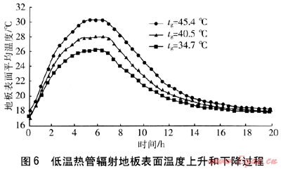 ① 熱管輻射地板在供水溫度為35~45℃時(shí)即可滿足采暖要求,比常規(guī)塑料埋管地板要求的供水溫度降低5℃左右。熱管輻射地板可以與低品位能源如太陽(yáng)能、地?zé)崮艿戎苯咏Y(jié)合應(yīng)用于采暖系統(tǒng)。